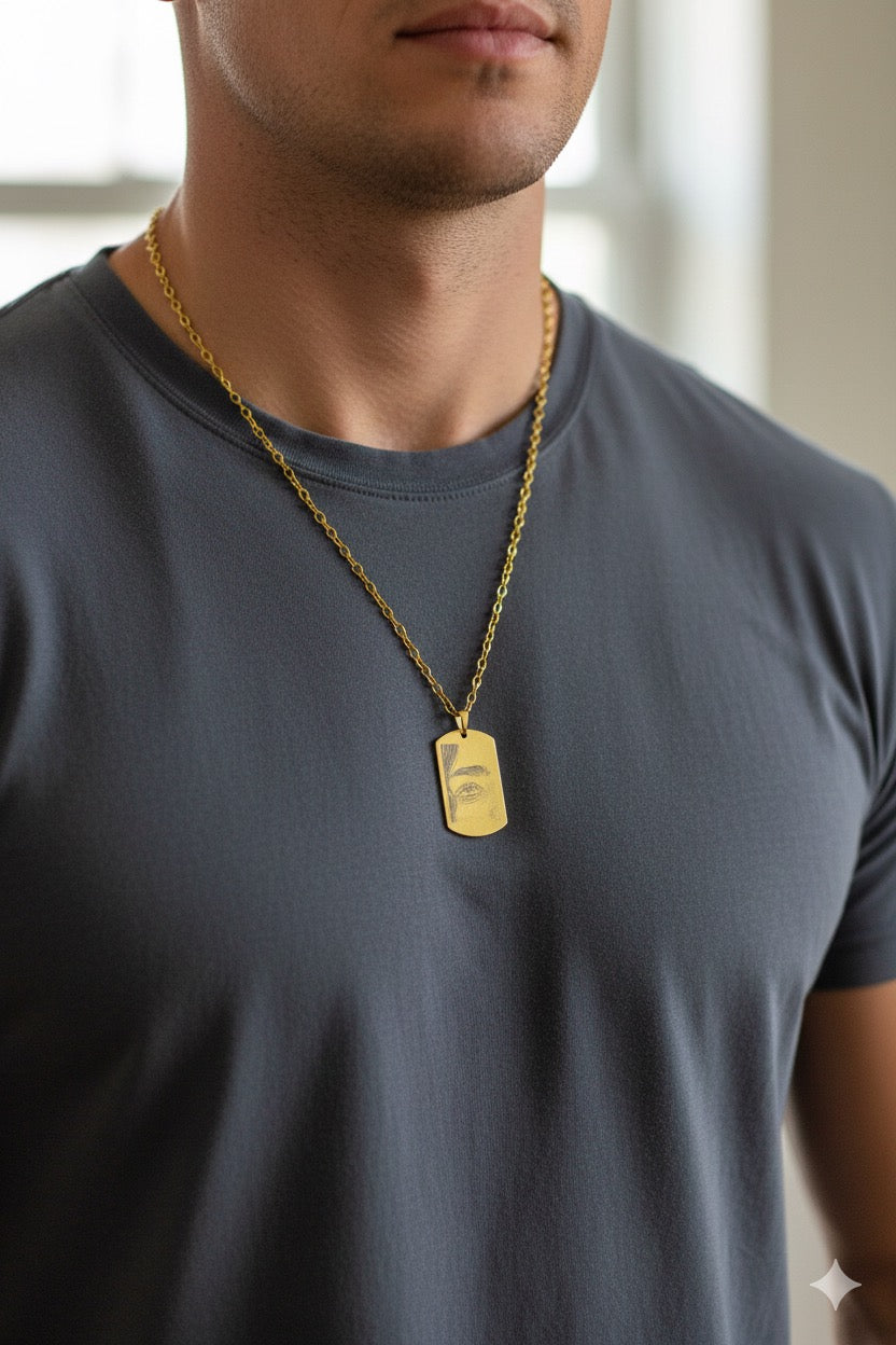 Placa rectangular dorada con grabado láser personalizado, perfecta para capturar un diseño, frase o símbolo especial. Hecha en metal de alta calidad con acabado dorado brillante y cadena a juego. Ideal como regalo único o accesorio especial.